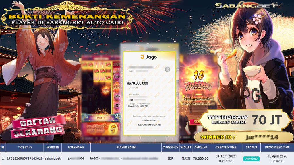 BUKTI KEMENANGAN 01 APRIL 2026 DI GAME oishi delight WD 70 JUTA
