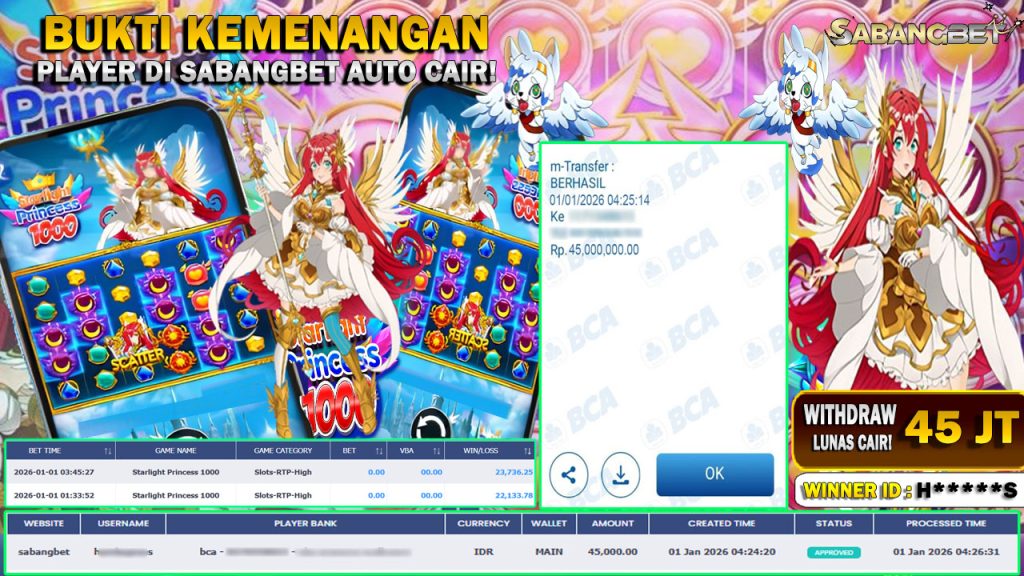 BUKTI KEMENANGAN 01 JANUARI 2026 DI GAME STARLIGHT PRINCESS 1000 WD 45 JUTA
