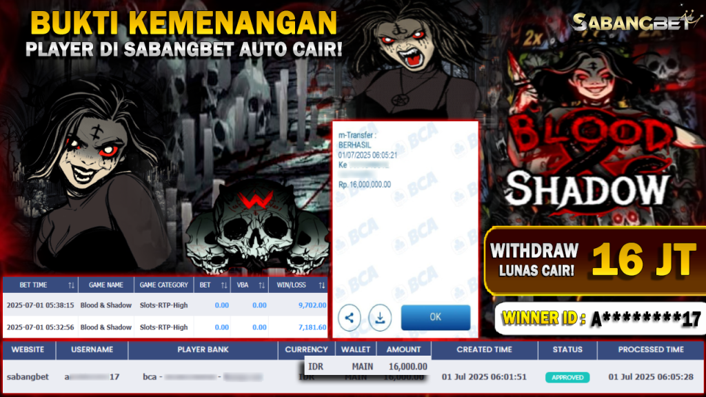 BUKTI KEMENANGAN 01 JULI 2025 DI GAME BLOOD & SHADOW WD 16 JUTA