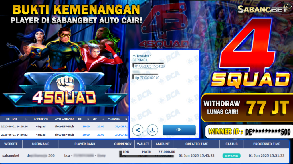 BUKTI KEMENANGAN 01 JUNI 2025 DI GAME 4SQUAD 77 JUTA