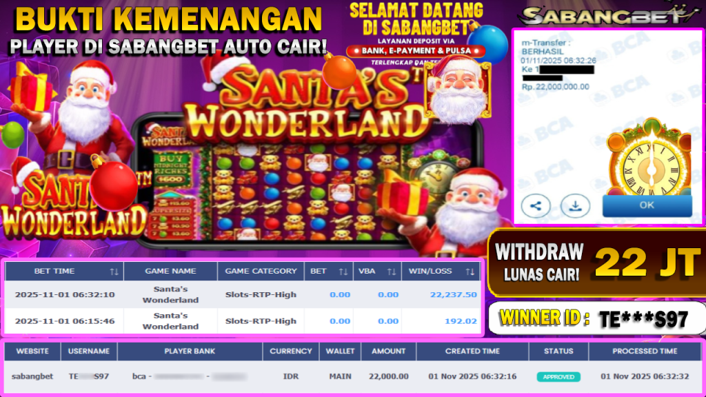 BUKTI KEMENANGAN 01 NOVEMBER 2025 DI GAME SANTA’S WONDERLAND WD 22 JUTA