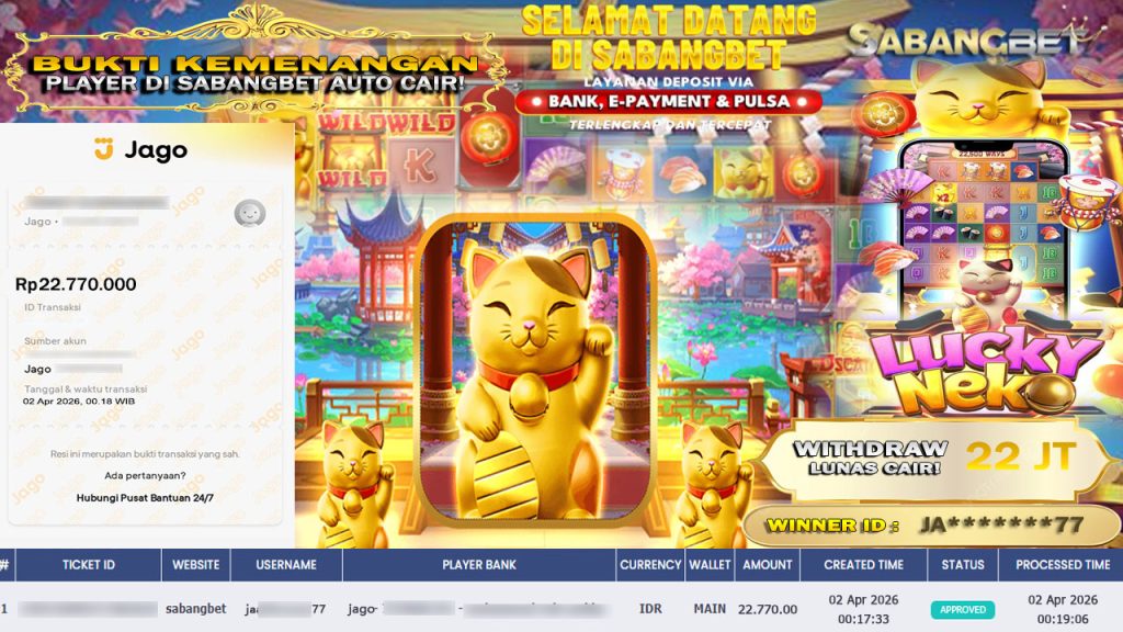 BUKTI KEMENANGAN 02 APRIL 2026 DI GAME LUCKY NEKO WD 22 JUTA