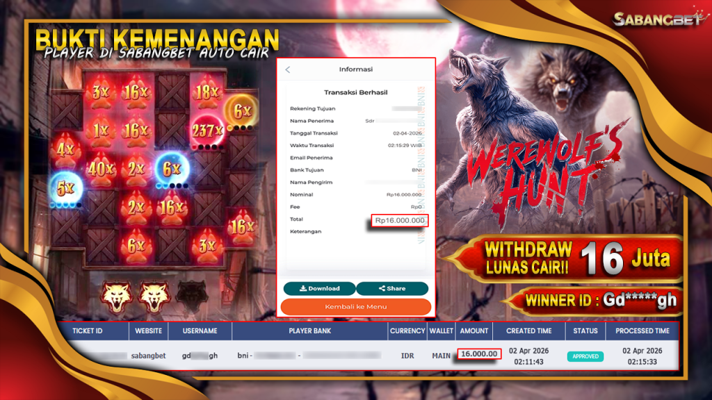 BUKTI KEMENANGAN 02 APRIL 2026 DI GAME Werewolf’s Hunt WD 16 JUTA