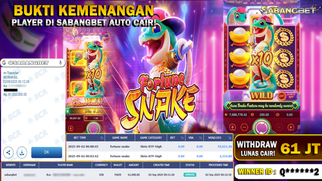 BUKTI KEMENANGAN 02 SEPTEMBER 2025 DI GAME FORTUNE SNAKE ( POCKET GAME SOFT ) WD 61 JUTA