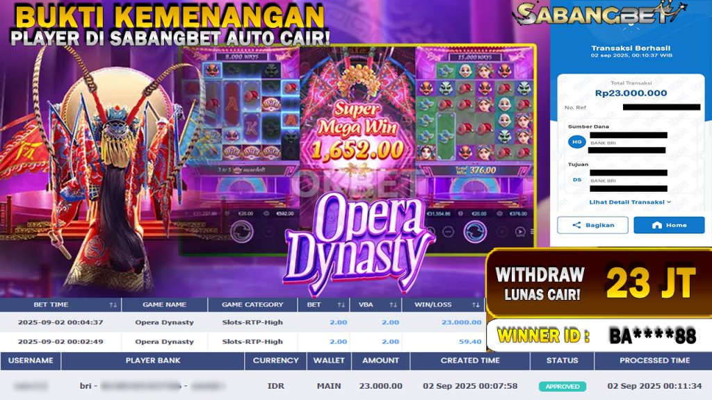 BUKTI KEMENANGAN 02 SEPTEMBER 2025 DI GAME Opera Dynasty WD 23 JUTA