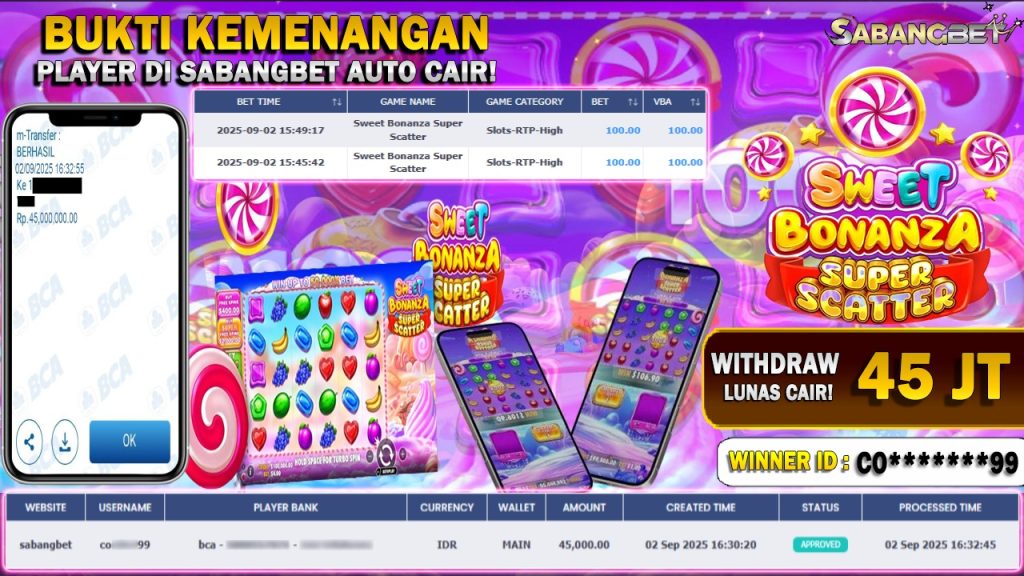 BUKTI KEMENANGAN 02 SEPTEMBER 2025 DI GAME SWEET BONANZA SUPER SCATTER WD 45 JUTA