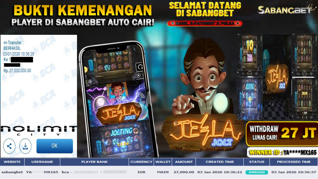 BUKTI KEMENANGAN 03 JANUARI 2026 DI GAME TESLA JOLT WD 27 JUTA