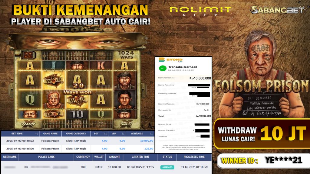 BUKTI KEMENANGAN 03 JULI 2025 DI GAME FOLSOM PRISON WD 10 JUTA