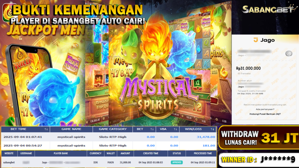 BUKTI KEMENANGAN 04 SEPTEMBER 2025 DI GAME MYSTICAK-SPIRITS ( POCKET GAME SOFT ) WD 31 JUTA