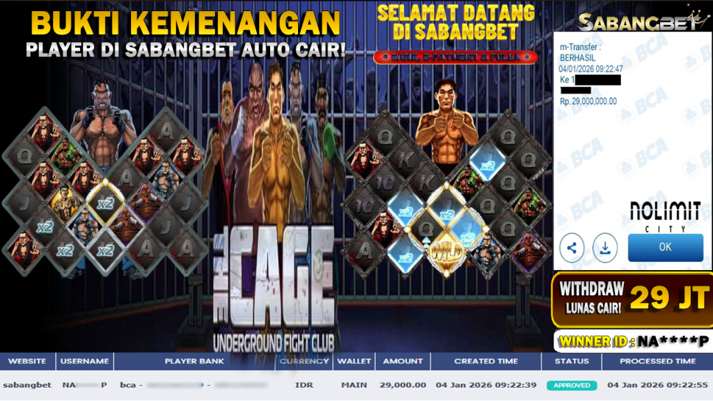 BUKTI KEMENANGAN 04 JANUARI 2026 DI GAME THE CAGE WD 29 JUTA