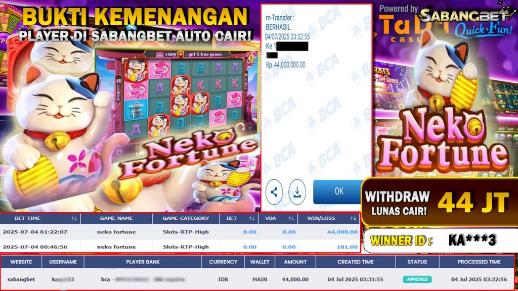 BUKTI KEMENANGAN 04 JULY 2025 DI GAME NEKO FPRTUNE WD 44 JUTA