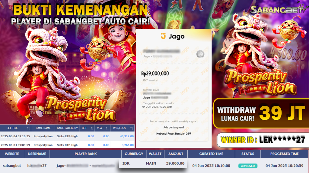 BUKTI KEMENANGAN 04 JUNI 2025 DI GAME PROSPERITY LION ‘PG SOFT’ WD 39 JUTA