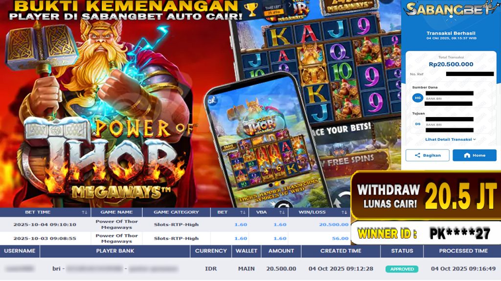 BUKTI KEMENANGAN 04 OKTOBER 2025 DI GAME Power Of Thor Megaways WD 20.5 JUTA