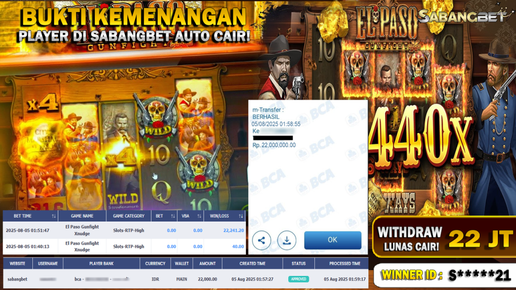 BUKTI KEMENANGAN 05 AGUSTUS 2025 DI GAME El PASO GUNFIGHT XNUDGE WD 22 JUTA