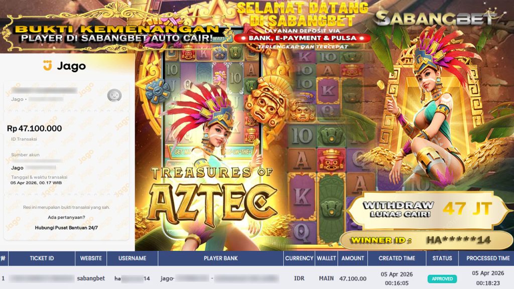 BUKTI KEMENANGAN 05 APRIL 2026 DI GAME TREASURES OF AZTEC WD 47 JUTA