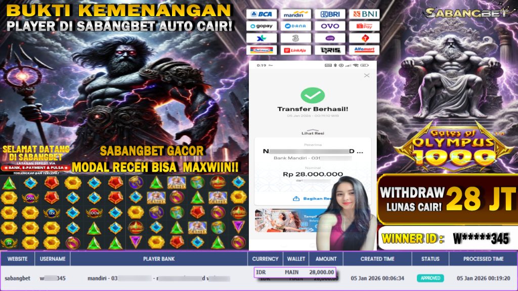 BUKTI KEMENANGAN 05 JANUARI 2026 DI GAME GATES OF OLYMPUS 1000 WD 28 JUTA