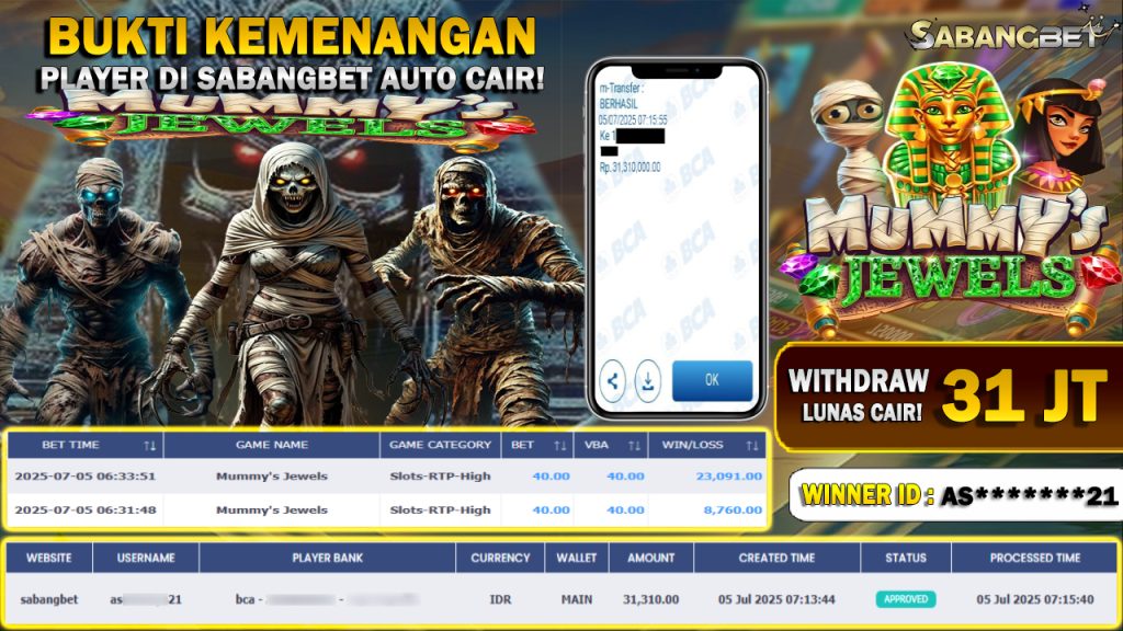 BUKTI KEMENANGAN 05 JULY 2025 DI GAME MUMMY’S JEWELS WD 31 JUTA