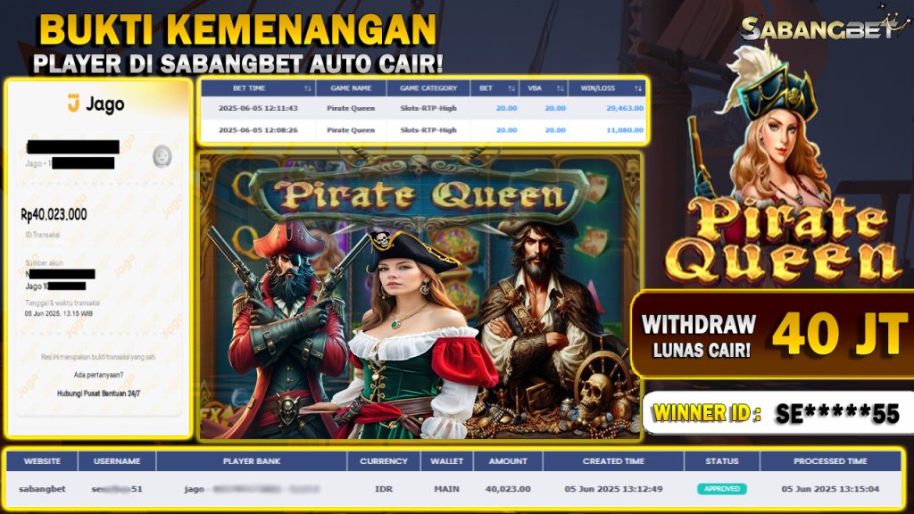 BUKTI KEMENANGAN 05 JUNI 2025 DI GAME PIRATE QUEEN ‘JILI’ WD 40 JUTA