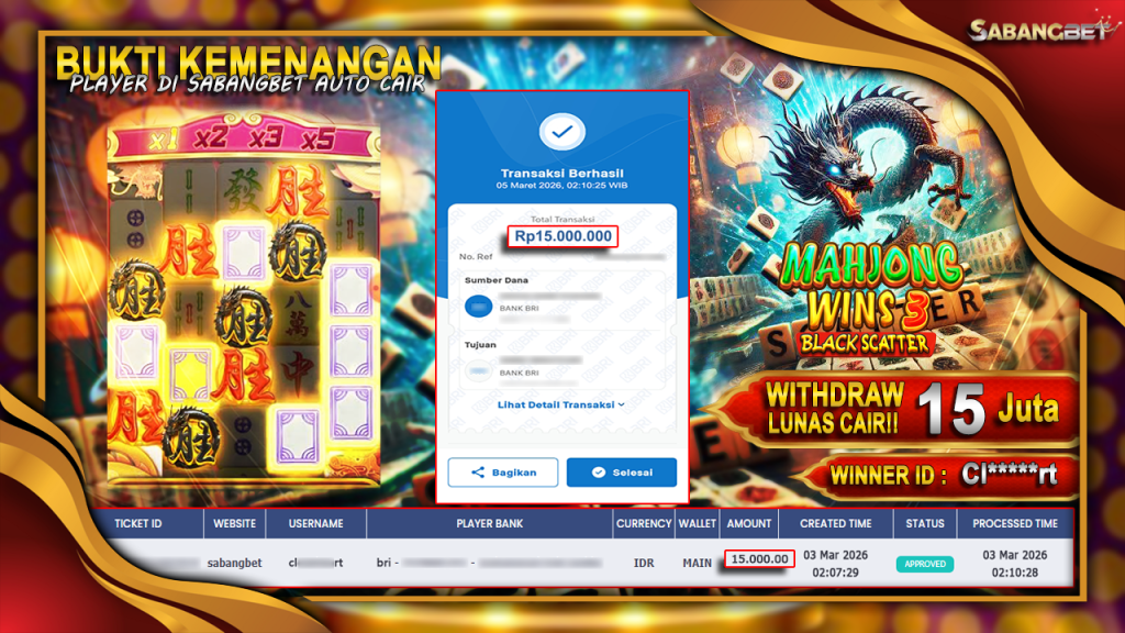 BUKTI KEMENANGAN 05 MARET 2026 DI GAME Mahjong Wins 3 Black Scatter WD 15 JUTA