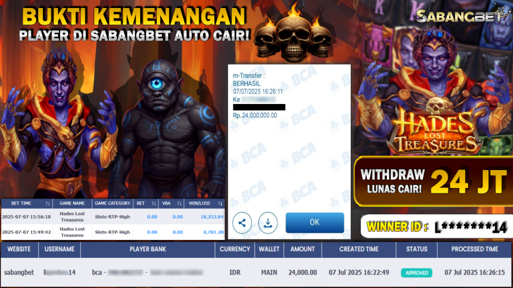 BUKTI KEMENANGAN 07 JULY 2025 DI GAME HADES LOST TREASURES WD 24 JUTA
