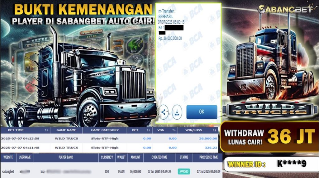 BUKTI KEMENANGAN 07 JULY 2025 DI GAME WILD TRUCS WD 36 JUTA