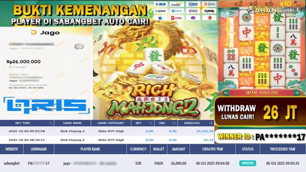 BUKTI KEMENANGAN 06 OKTOBER 2025 DI GAME RICH MAHJONG2 WD 26 JUTA