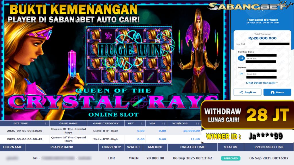BUKTI KEMENANGAN 06 SEPTEMBER 2025 DI GAME Queen Of The Crystal Rays 28 JUTA