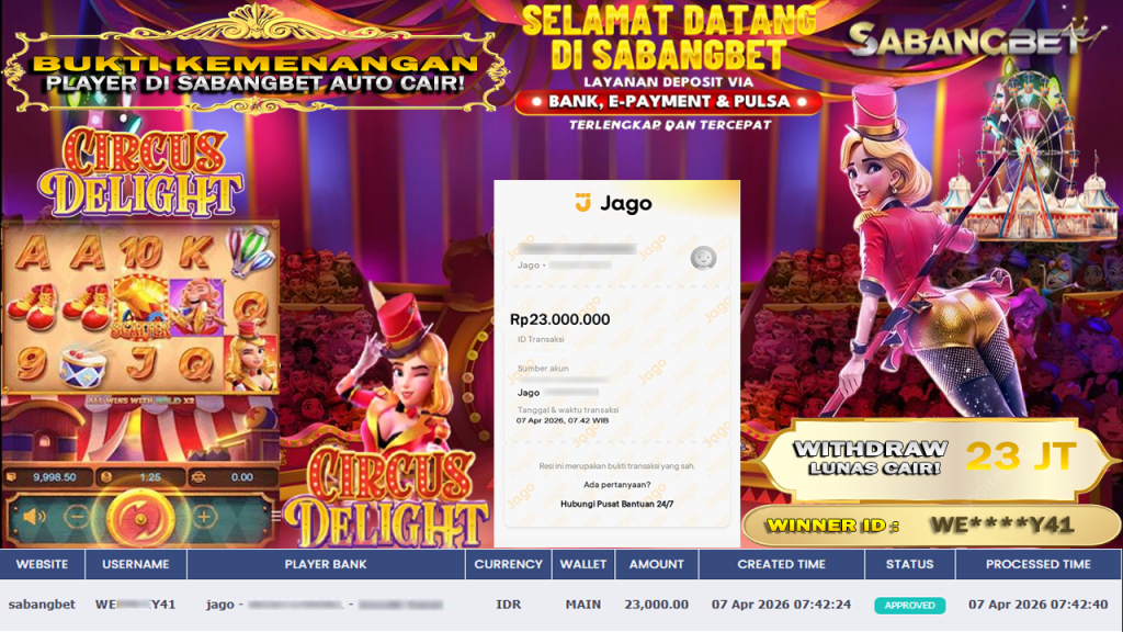 BUKTI KEMENANGAN 07 APRIL 2026 DI GAME CIRCUS DELIGHT WD 23 JUTA