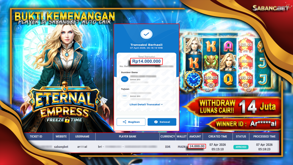 BUKTI KEMENANGAN 07 APRIL 2026 DI GAME Eternal Empress Freeze Time WD 14 JUTA