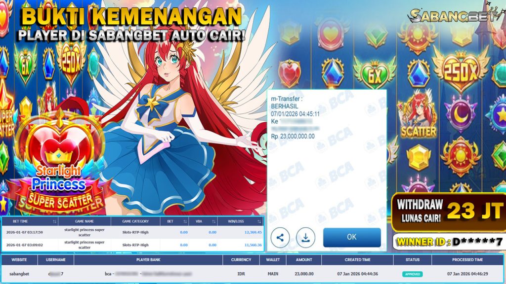 BUKTI KEMENANGAN 07 JANUARI 2026 DI GAME STARLIGHT PRINCESS SUPER SCATTER WD 23 JUTA