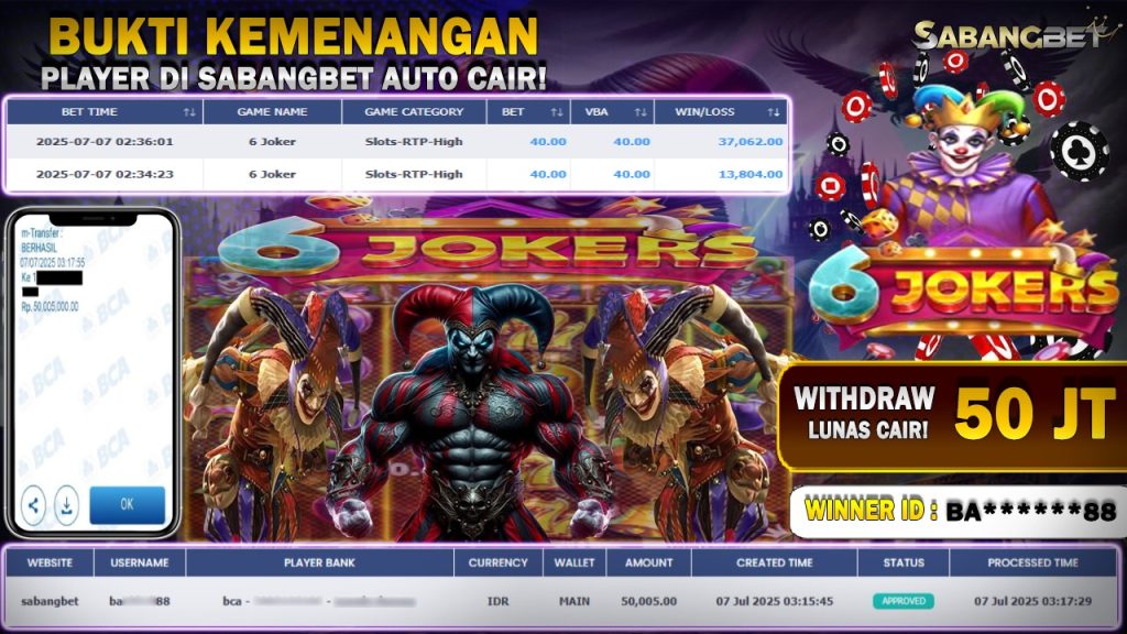 BUKTI KEMENANGAN 07 JULY 2025 DI GAME 6 JOKERS WD 50 JUTA