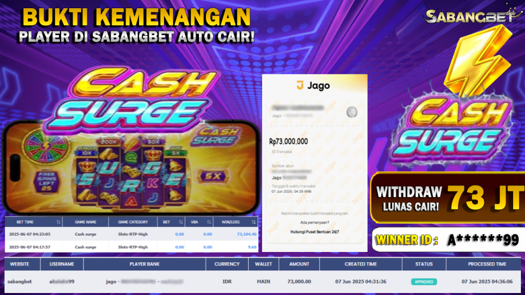 BUKTI KEMENANGAN 07 JUNI 2025 DI GAME CASH SURGE WD 73 JUTA