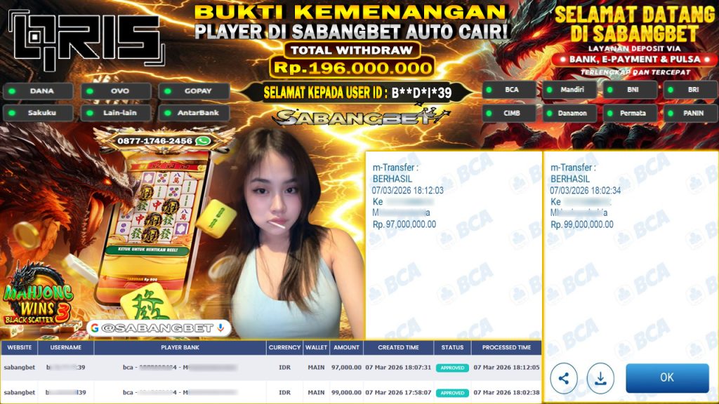 BUKTI KEMENANGAN 07 MARET 2026 DI GAME MAHJONG WINS 3 BLACK SCATTER WD 196 JUTA