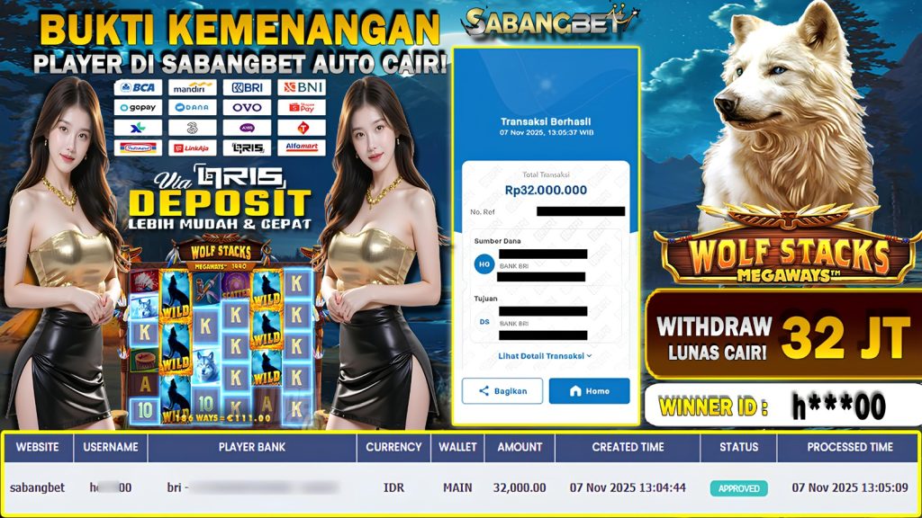 BUKTI KEMENANGAN 07 NOVEMBER 2025 DI GAME WOLF STACKS MEGAWAYS WD 32 JUTA