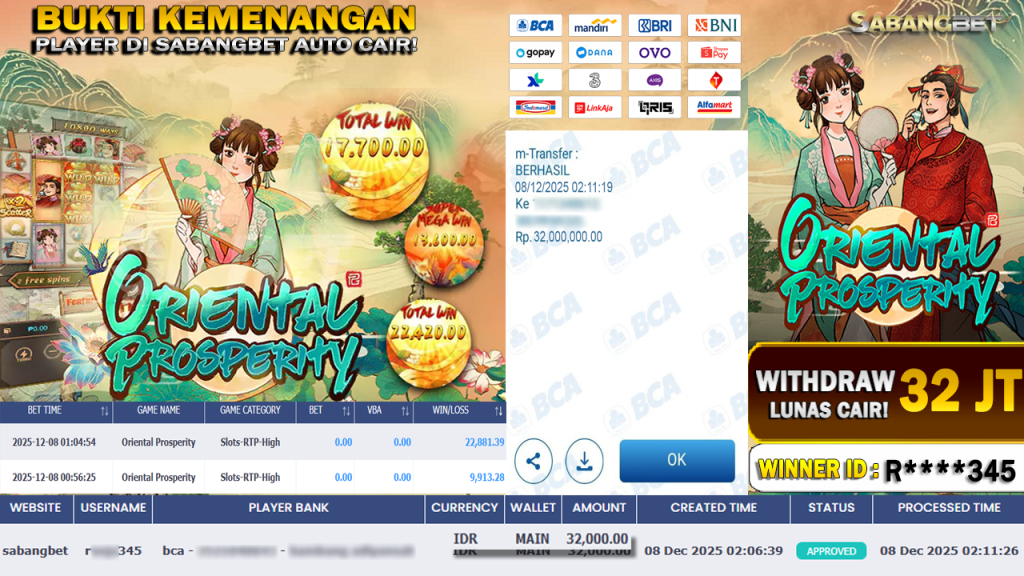 BUKTI KEMENANGAN 08 DESEMBER 2025 DI GAME ORIENTAL PROSPERITY WD 32 JUTA