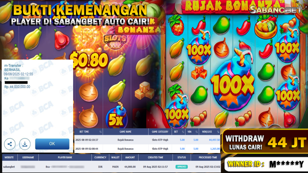 BUKTI KEMENANGAN 09 AGUSTUS 2025 DI GAME RUJAK BONANZA WD 44 JUTA