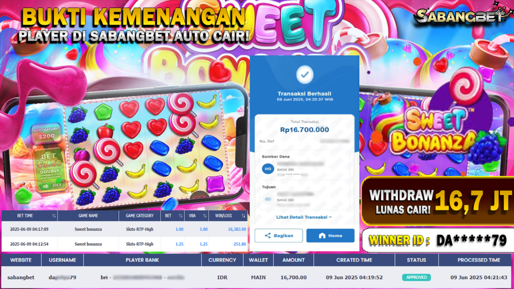BUKTI KEMENANGAN 09 JUNI 2025 DI GAME SWEET BONANZA WD 16,7 JUTA