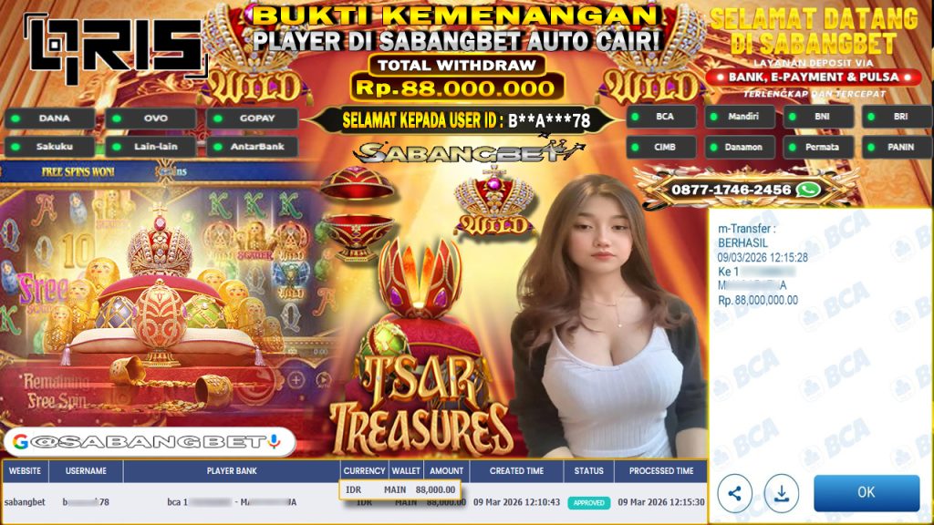 BUKTI KEMENANGAN 09 MARET 2026 DI GAME TSAR TREASURES WD 88 JUTA