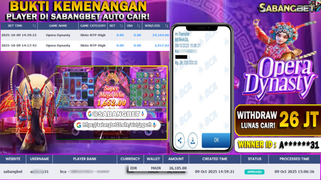 BUKTI KEMENANGAN 09 OKTOBER 2025 DI GAME OPERA DYNASTY WD 26 JUTA