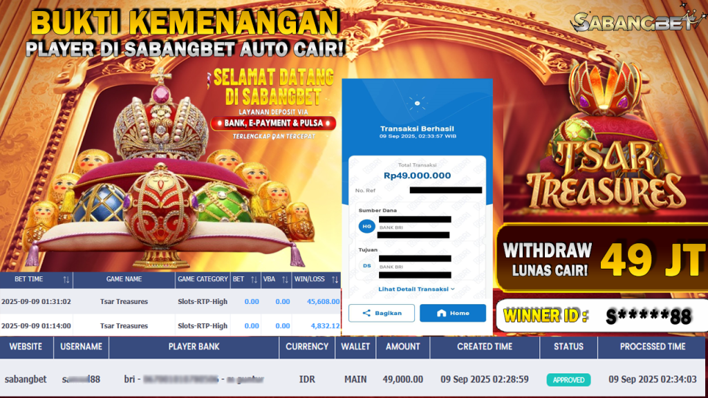 BUKTI KEMENANGAN 09 SEPTEMBER 2025 DI GAME TSAR TREASURES WD 49 JUTA