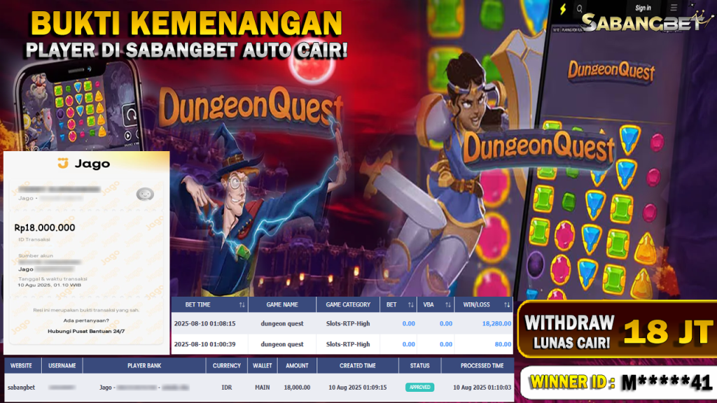 BUKTI KEMENANGAN 10 AGUSTUS 2025 DI GAME DUNGEON QUEST WD 18 JUTA
