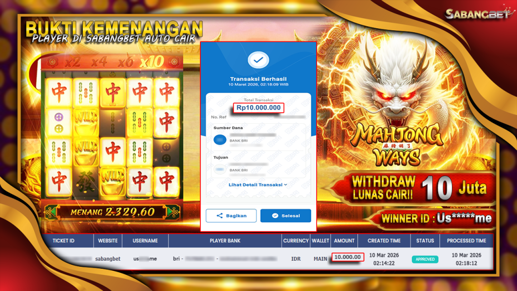 BUKTI KEMENANGAN 10 MARET 2026 DI GAME Mahjong Ways WD 10 JUTA
