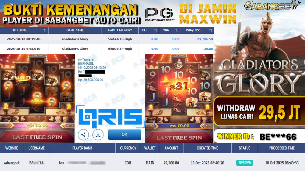 BUKTI KEMENANGAN 10 OKTOBER 2025 DI GAME GLADIATOR GLORY WD 29,5 JUTA