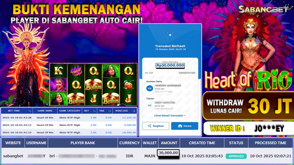 BUKTI KEMENANGAN 10 OKTOBER 2025 DI GAME HEART OF RIO WD 30 JUTA