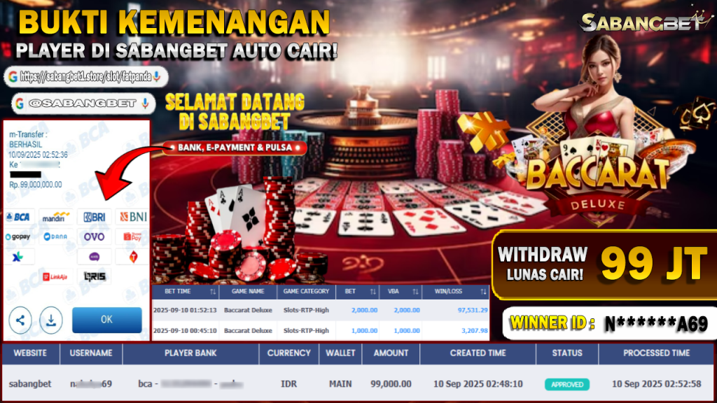 BUKTI KEMENANGAN 10 SEPTEMBER 2025 DI GAME BACCARAT DELUXE WD 99 JUTA