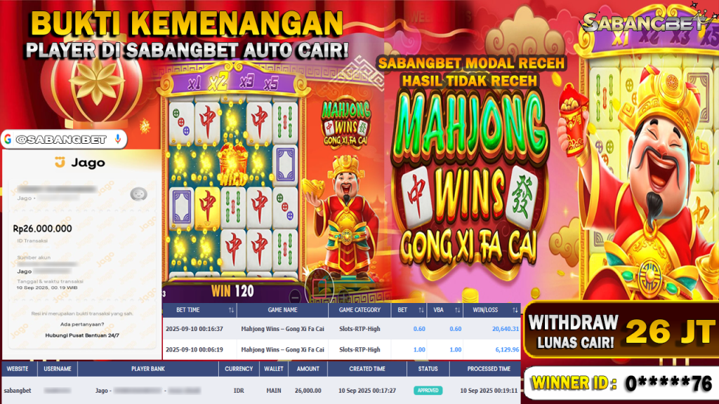 BUKTI KEMENANGAN 10 SEPTEMBER 2025 DI GAME MAHJONF WINS – GONG XI FA CAI ( PRAGMATIC PLAY ) WD 26 JUTA