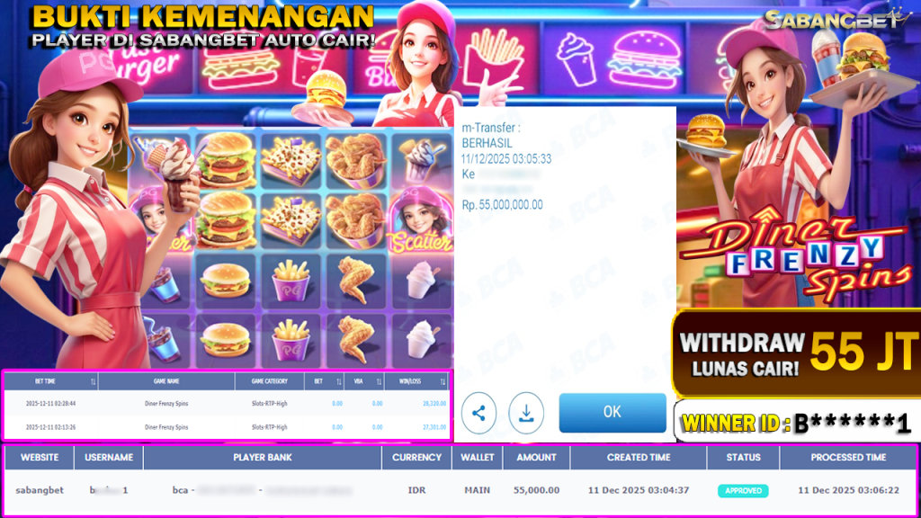 BUKTI KEMENANGAN 11 DESEMBER 2025 DI GAME DINER FRENZY SPINS WD 55 JUTA