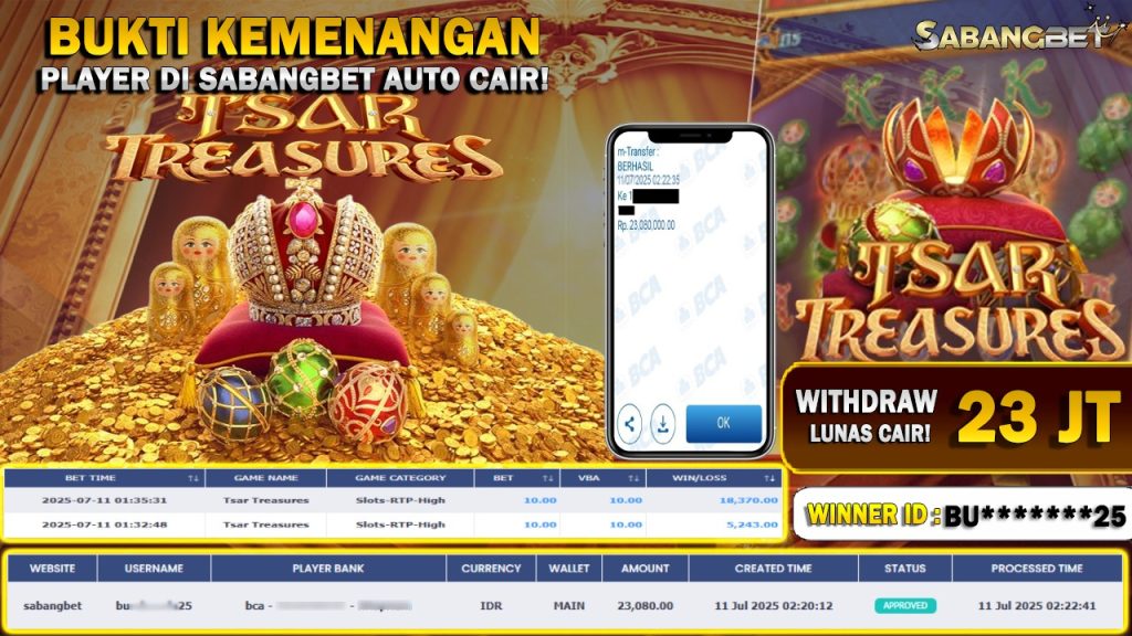 BUKTI KEMENANGAN 11 JULY 2025 DI GAME TSAR TREASURES WD 23 JUTA