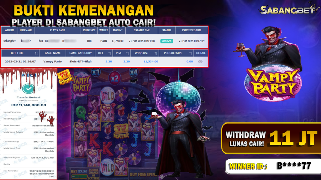 BUKTI KEMENANGAN 21 MARET 2025 DI GAME VAMPY PARTY WD 11 JUTA