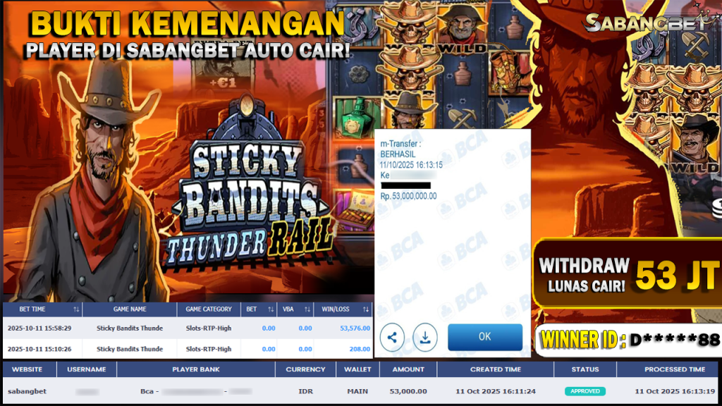 BUKTI KEMENANGAN 11 OKTOBER 2025 DI GAME STICKY BANDITS THUNDER WD 29 JUTA